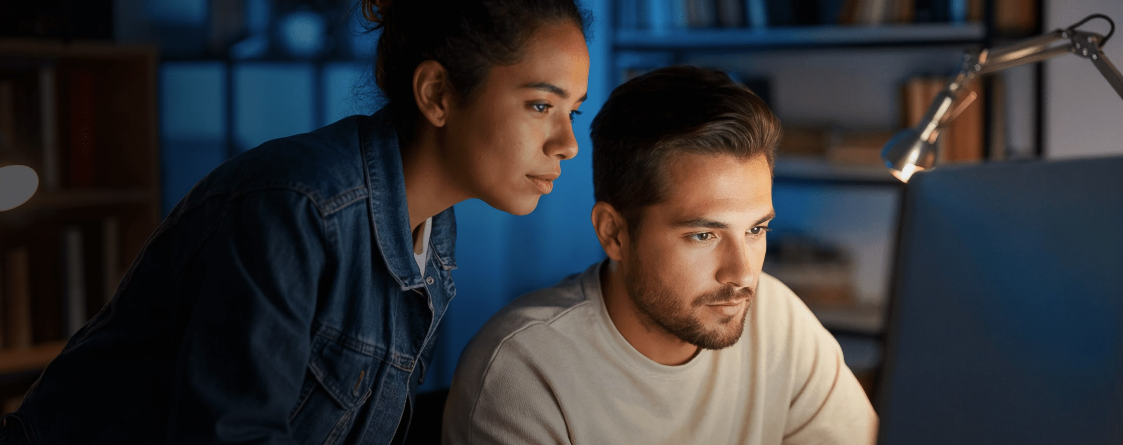 Man and woman with HP 168官方澳洲幸運(yùn)5結(jié)果體彩網(wǎng) laptops in an office, participating in a meeting and sharing ideas.
